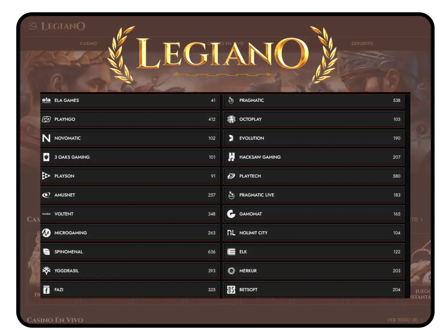 En Legiano casino en línea nutrimos tu espíritu guerrero con los mejores proveedores de software del mundo. Al día de hoy contamos con 88 vendedores que incluyen a los más respetados y prestigiosos de la industria.